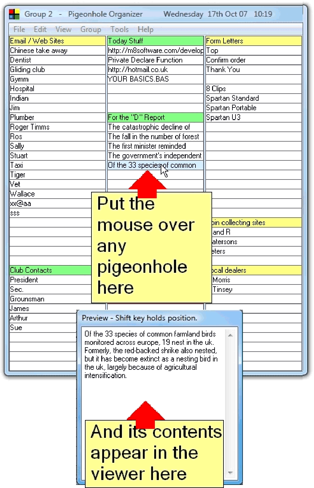 Nada más ejecutar el software Pigeonhole Organizer lo primero que te vas a encontrar es una ventana principal en la que aparecen 175 celdas divididas en cinco columnas diferentes. Al hacer clic en cualquiera de ellas se abrirá un editor de texto mediante el cual podrás escribir todo lo que necesites. En este sentido incluso podrás incluir caracteres ASCII y etiquetas HTML. También dispone de campos específicos para la inclusión de números de teléfono direcciones de correo electrónico etc.
